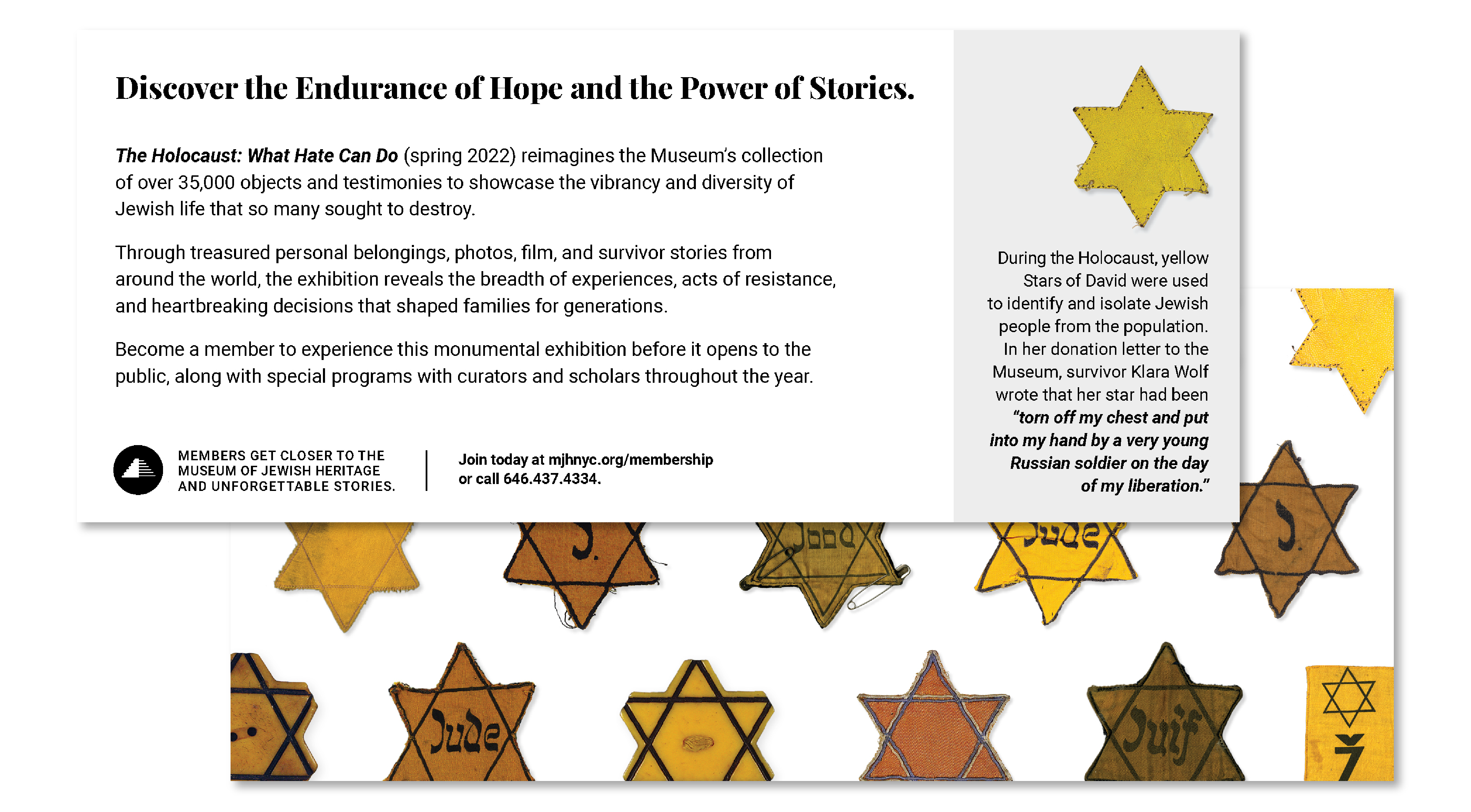Ranging from membership materials to the Museum Map to exterior signage, the on-going partnership with the Museum of Jewish Heritage develops materials serving multiple audiences, varying in age and background. The visual language has been further refined by branding the core collection as well as special events and exhibitions.